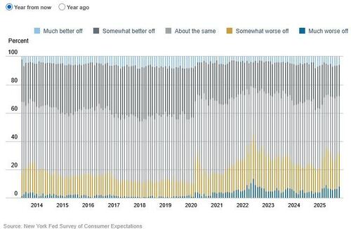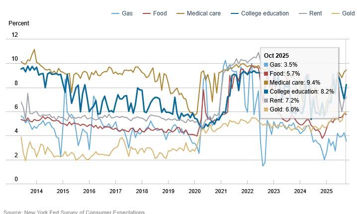 … while year-ahead commodity price change expectations declined by 0.7 percentage point for gas to 3.5% and by 0.1 percentage point for food to 5.7%. The year-ahead price change expectations increased by 1.2 percentage points for the cost of college education to 8.2%, by 0.1 percentage point for the cost of medical care to 9.4% (the highest reading since February 2023), and by 0.2 percentage point for rent to 7.2%.