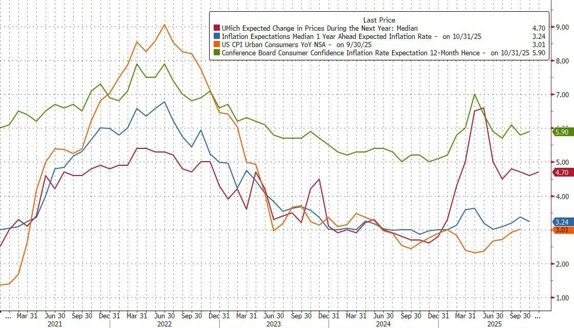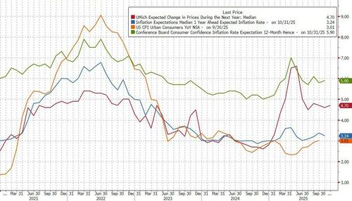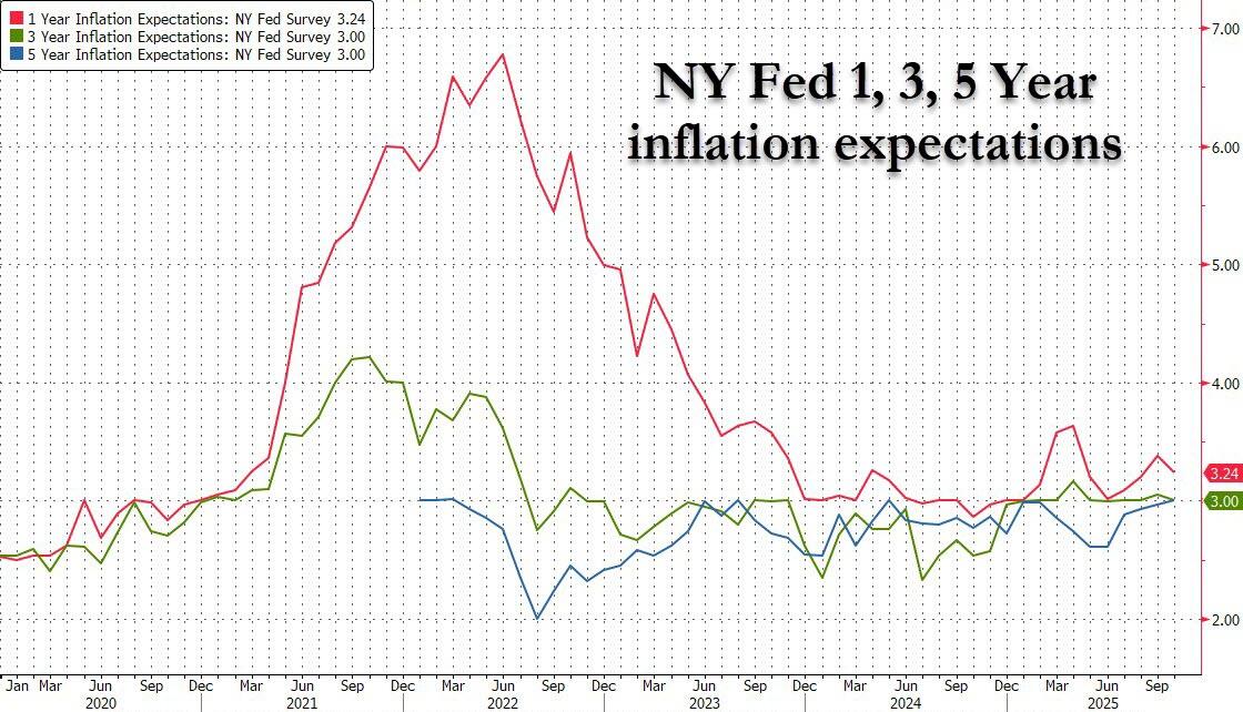 Starting with the former, expectations for consumer price increases in the year ahead ticked down to 3.2% in October from 3.4% in September – which was the highest since April – while measures for three and five years ahead were unchanged changed at 3%.