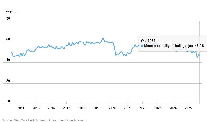 Tied to that, the survey showed consumers saw a smaller chance in October of finding a new position in the event of job loss. In line with what economists have described as a low-firing, low-hiring job environment, the perceived chances of voluntarily leaving a job fell, while the odds of job loss also declined.
