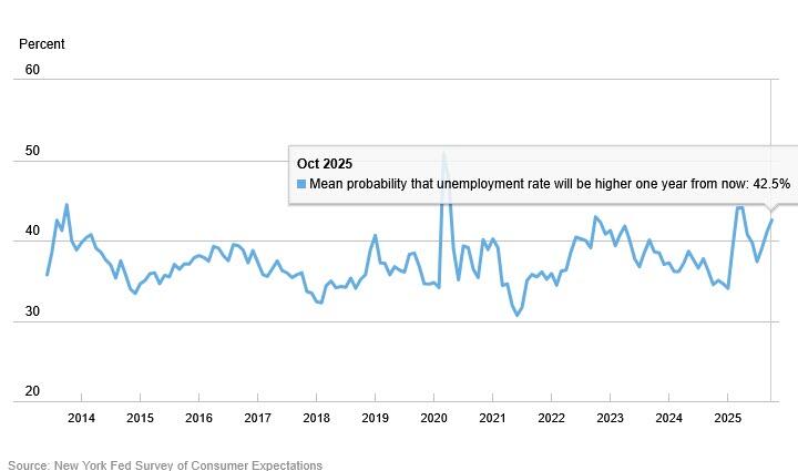 Unemployment expectations rose for a third straight month as consumers assigned an average 43% probability  –  the highest since April  – to the likelihood the US unemployment rate will be higher one year from now.