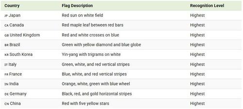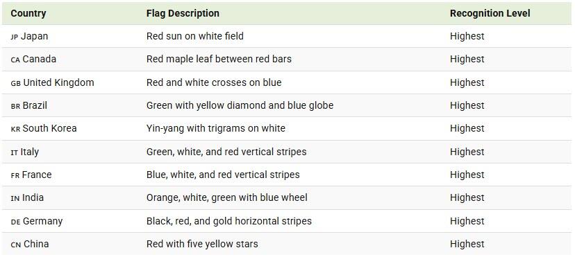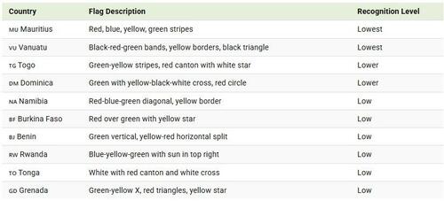 The U.S. flag was still extremely identifiable, but lagged just a little bit behind these other countries in quiz results. Reasons for this are unclear, but it could be because Liberia, Malaysia, Uruguay, and even Chile have similar patterns with stars and stripes on their flags.
