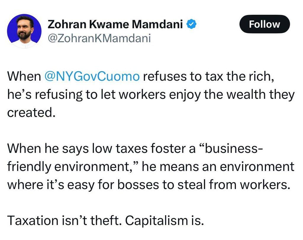 “When @NYGovCuomo refuses to tax the rich, he’s refusing to let workers enjoy the wealth they created,” wrote Zohran Mamdani in the lead up to his election.