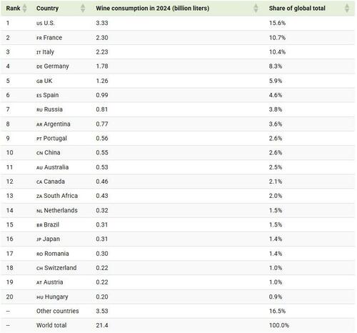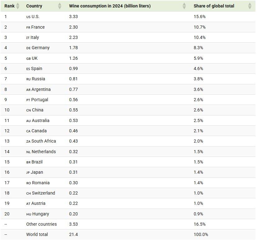 According to the OIV, global wine consumption totaled roughly 21.5 billion liters in 2024, with just 10 countries accounting for more than 70% of that total.