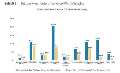Finally, for those seeking relative Bitcoin to DC conversion metrics, the following table shows the latest Enterprise Value/ watt multiples for Bitcoin stocks – it includes all large sites (>100 MW) with firm grid access. Needless to say, the lower the column, the cheaper the potential conversion opportunity.