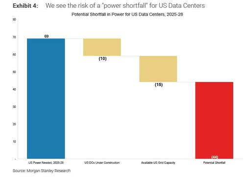 While the full Morgan Stanley note is a must read for those who have an interest in the AI trade, and certainly in the details of the “Next AI trade”, and includes a detailed analysis on Bitcoin-to-Data center conversions, the non-linear rate of AI improvement and the continued upward growth in compute demand (we urge all pro subscribers to read it), what we focus on in this post is the bank’s revised estimate of power shortfall facing US data center developers (we will discuss the financial implications in a subsequent post, suffice to note that 1GW in data center capacity costs roughly $50 – 60 billion in total capex spend).