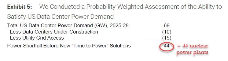 Our conviction in this trade was only reinforced by an analysis from Morgan Stanley last December, which found that for the 2025-28 period, “we project ~57 gigawatts (GW) of US data center power demand, and we quantify available power capacity to serve this demand as: near-term grid access of ~12-15 GW, plus ~6 GW of data centers under construction, resulting in a ~36 GW shortfall of US power access for data centers in 2025-28.” Indicatively 36GW is sufficient to power ~27 million homes. Instead it will be going to power chatbots.