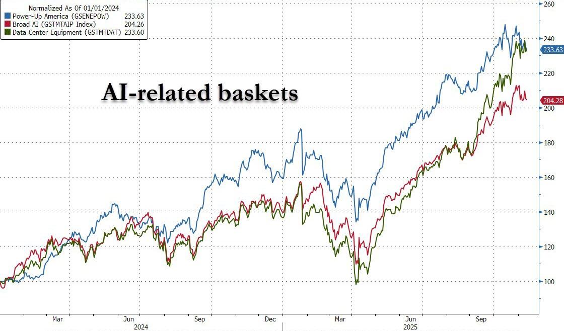 For much of the past 18 months we have been banging the table on what we said would be the Next AI Trade (which we first discussed in April 2024) pitching the “picks and shovels” angle of the AI revolution, namely going long the “Power-Up America” basket – i.e., companies that produce and support the massive energy backbone that will be needed to energize the hundreds of new data centers popping up across the country (and which in some cases are now dark because they don’t have access to energy) predicting that energy would materially outperform the pure AI/data center trade. That’s precisely what has happened as the following chart breaking down the AI trade into its three core components – broad AI, data center equipment, and our preferred trade, Power Up America (or energize the grid) – shows. The blue line has doubled since we first discussed its merits in April ’24.