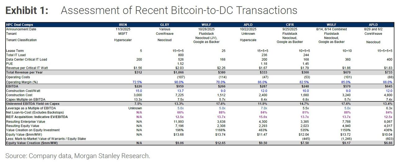 Under the “new neocloud” model, most notably exhibited by IREN, the Bitcoin miner purchases GPUs/TPUs, builds the entire data center and leases the facility to hyperscalers and other customers – potentially under leases with relatively short durations (such as the 5-year lease signed by IREN with Microsoft). Under the “REIT endgame” model, the Bitcoin miner builds the “powered shell” (typically, everything but the chips + servers) and signs a lease with a neocloud and/ or hyperscaler, typically under fairly long-term leases (such as the APLD 15-year lease with an unnamed hyperscaler). We see value creation potential with respect to both approaches. The following chart provides an overview of the Bitcoin-to-DC conversion transactions, including the “colocation” portion of the “new neocloud” transaction recently entered into between IREN and Microsoft: