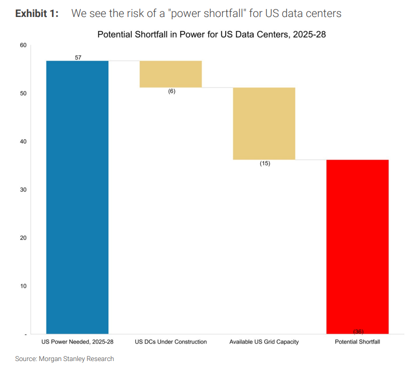 Assuming these Time to Power solutions are implemented, Morgan Stanley concludes that through 2028, we could experience a power shortfall totaling as much as 20%, which equates to a ~13 gigawatt (GW) shortfall, better than the 44GW base case above but still a huge gap of roughly 13 nuclear power plant. That said, an even more rapid increase in “time to power” solutions have the potential to eliminate this shortfall (and would certainly cost an arm and a leg).