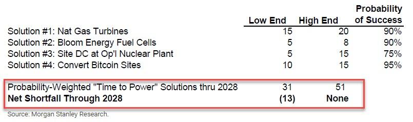 For its revised projection, Morgan Stanley conducted a probability-weighted assessment of the ability to satisfy US data center power demand, and found that with 69GW in total data center power demand from today until 2028, some 10GW will be satisfied with Data Centers under construction, and another 15GW through Utility Grid Access.