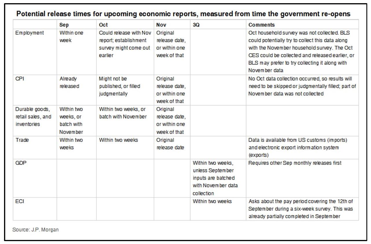 In any case, with the government set to reopen (before it partially closes again in January) here is JPMorgan’s best estimate of when we can expect various reports over the coming weeks.