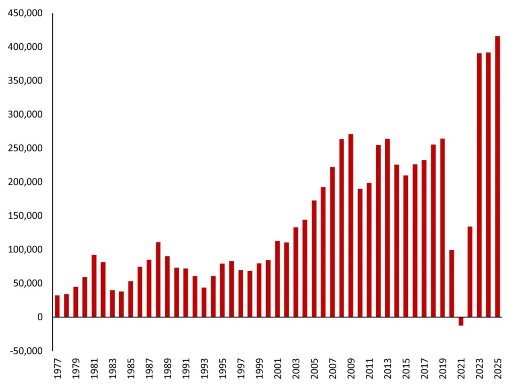 According to the latest Australian Bureau of Statistics data, there were 415,760 net permanent and long-term arrivals between January 1 and September 30, the highest ever, and 6% higher than in 2024, which set the previous record.