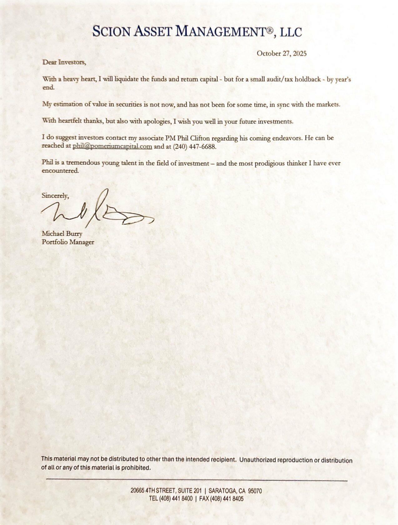 Burry sent a letter to investors late last month, noting: “With a heavy heart, I will liquidate the funds and return capital — but for a small audit/tax holdback — by year’s end.”