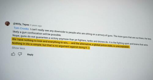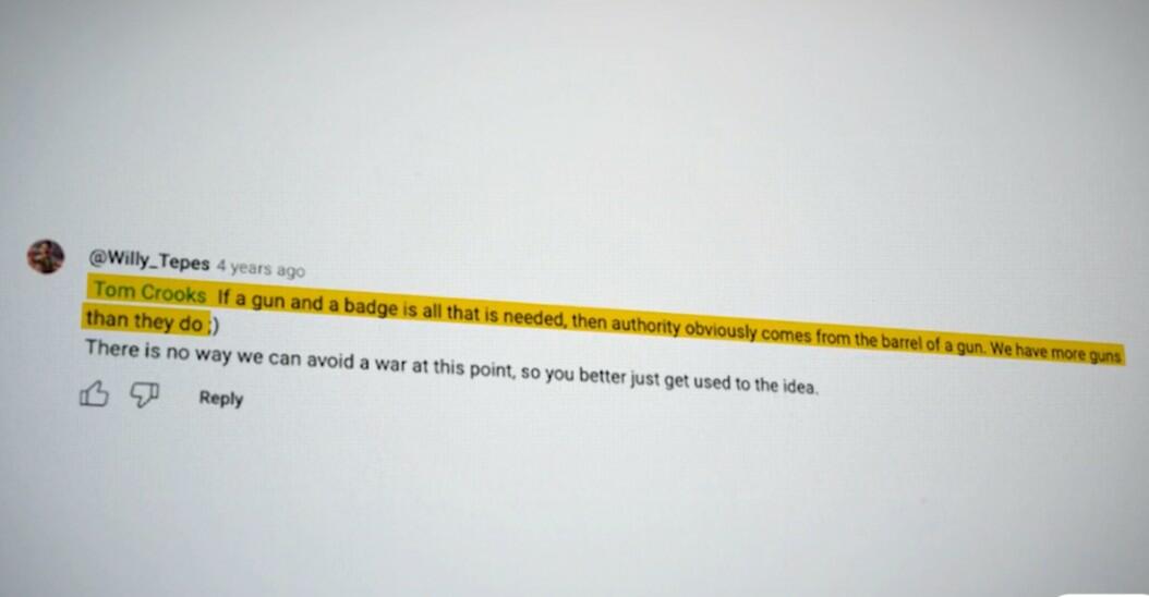 Then – a YouTube user @Willy_Tepes began seemingly encouraging Crooks… writing “If a gun and a badge is all that is needed, then authority obviously comes from the barrel of a gun. We have more guns than they do ;)”
