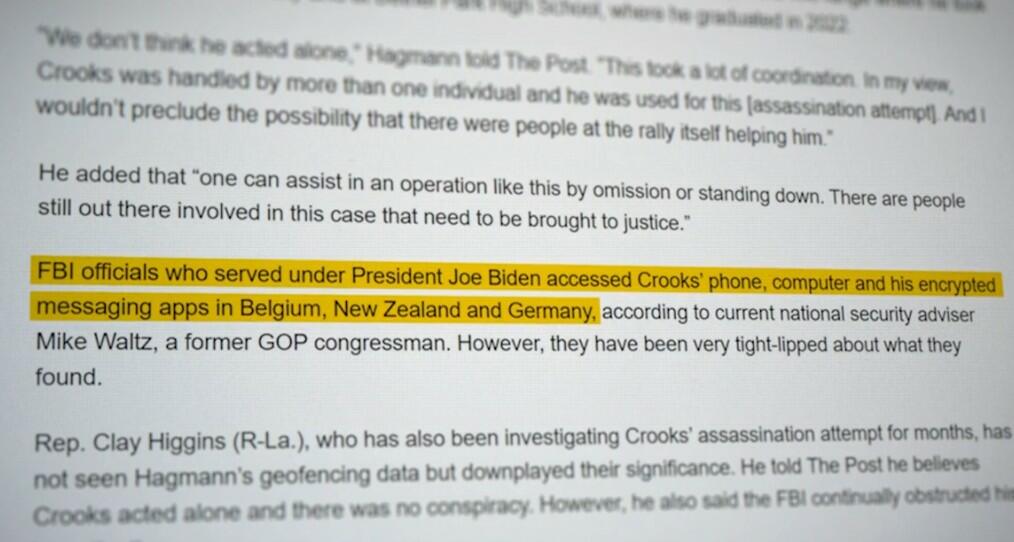 - Biden FBI officials accessed Crooks’ phone using software from an Israeli firm, Cellebrite, and accessed his phone, computer and his encrypted messaging apps in Belgium, New Zealand and Germany – “yet none of the online activity the FBI discovered was referred to in any way in the final Congressional report.”