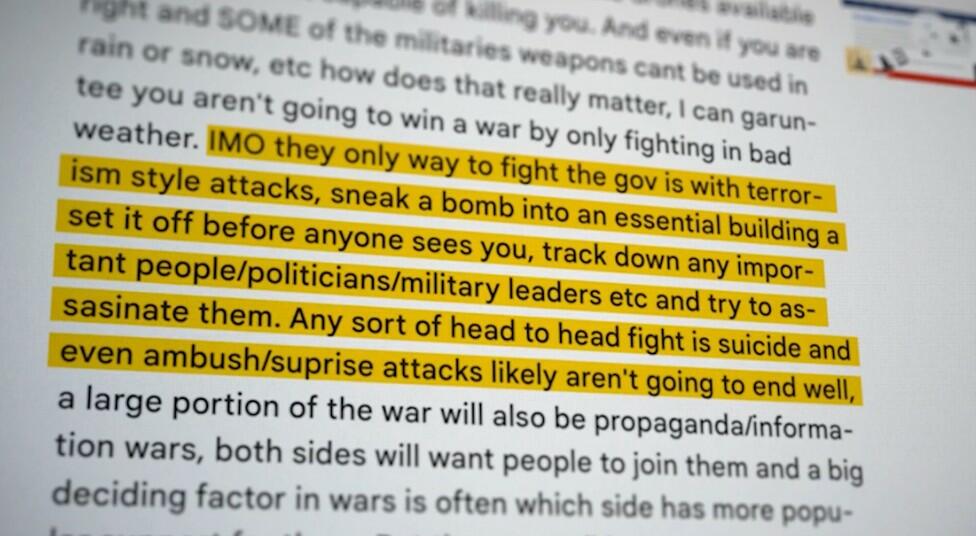 “they only way to fight the gov is with terror-ism style attacks, sneak a bomb into an essential building a set it off before anyone sees you, track down any important people/politicians/military leaders etc and try to asasinate them. Any sort of head fight is suicide and even ambush/surprise attacks likely aren’t going to end well.”