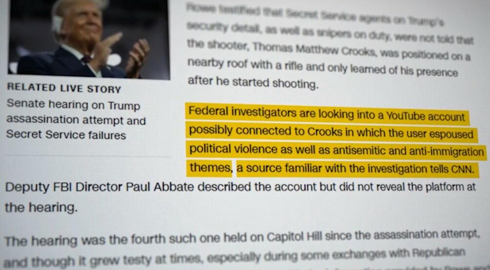 Two and a half weeks after the attack, a ‘source familiar with the investigation’ told CNN that “Federal investigators are looking into a YouTube account possibly connected to Crooks in which the user espoused political violence as well as antisemitic and anti-immigration themes.“