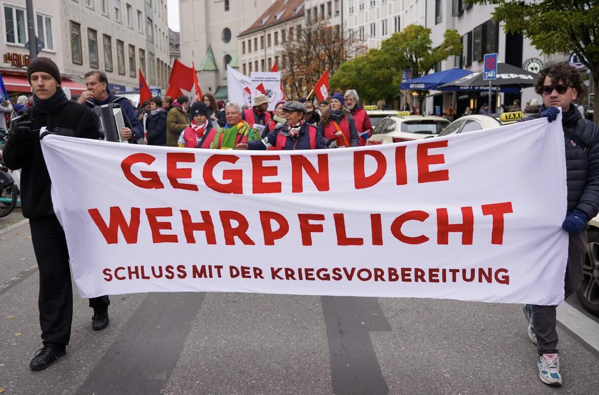 Earlier this month, protesters in Munich carried a banner that read “Against Conscription. End War Preparation.” (Michael Nguyen/NurPhoto/ Getty via The Times)
