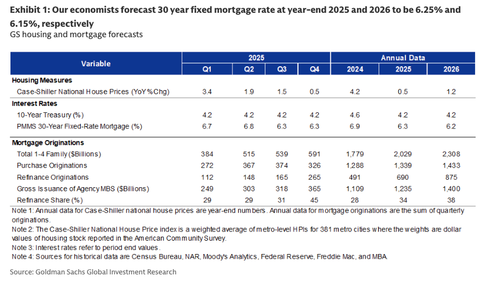 GS economists forecast 30 year fixed mortgage rate at year-end 2025 and 2026 to be 6.25% and 6.15%, respectively