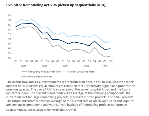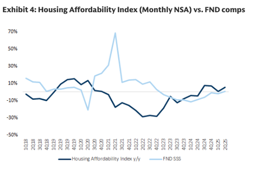 Our economists have noted that HELOC deal issuance has increased since 2023, with YTD 2025 (until 10/8/25) volume reaching post-GFC highs. The seemingly renewed interest in HELOC securitization is likely a function of both increased HELOC usage by homeowners and greater demand from investors in the securitization market. Our economists now suggest potential for significant further growth in HELOC in the coming years and expect home equity debt outstanding growth rate to tick-up slightly to around $15-17 bn/quarter in 2026 (vs. $14bn/quarter over the past 5 quarters), driven by lower financing rates and increased demand for tapping into equity. In spite of this higher activity level however, the company continues to see homeowners favor smaller-scope projects amid affordability constraints. However, we believe FND is positioned to capture potential HELOC-driven upside as macro transmission improves.