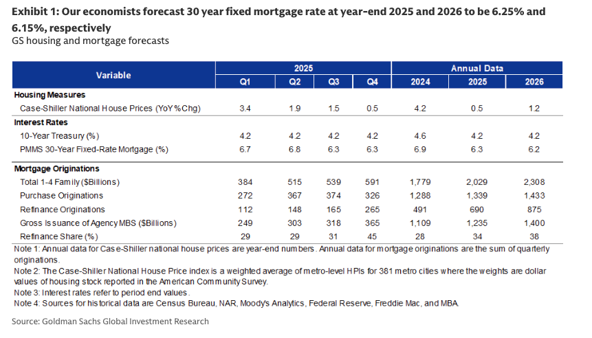 GS economists forecast 30 year fixed mortgage rate at year-end 2025 and 2026 to be 6.25% and 6.15%, respectively