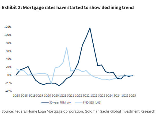 For more color on the housing market, we turn to Goldman Sachs Managing Director Kate McShane, who told clients Thursday the housing backdrop is set to improve in 2026, with mortgage rates drifting toward 6.15% and pent-up demand helping home-price appreciation recover.