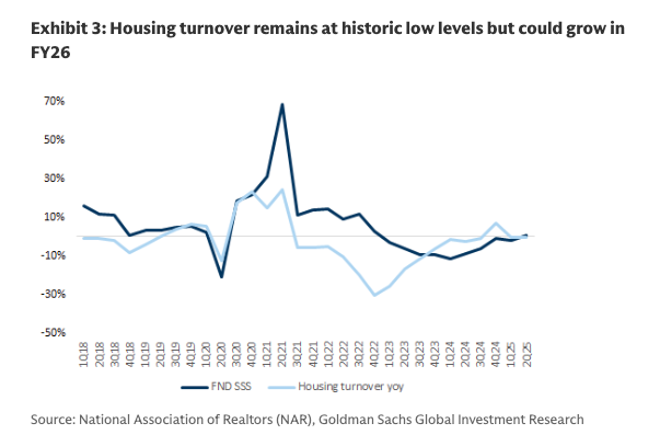 The housing market is anticipated to experience a more favorable environment in FY26 and our economists forecast mortgage rates at year-end 2025 and 2026 to be 6.25% and 6.15%, respectively. Our economists noted if mortgage rates remain around 6.15% (in line with their expectation), the pace of home price appreciation is likely to start to recover in 2026 due to pent-up housing demand. Our economists expect housing turnover to be flat to marginally higher in FY25 and projects a +5-7% increase in 2026 compared to 2025. Floor & Décor’s comparable store sales (comps) are highly correlated to housing turnover, as replacing floors is one of the first improvements many new or existing home purchasers undertake. The company’s focus on a growing Pro customer base and high-margin design services also provides growth opportunities as the market recovers.
