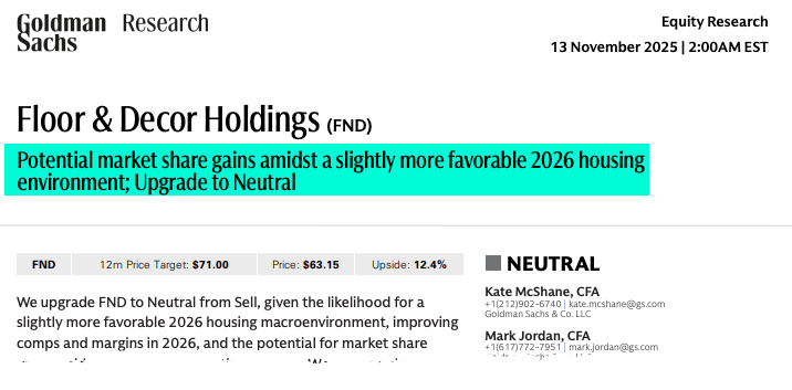 Here is McShane’s view on the housing market, based on her upgrade of flooring company Floor & Décor from “Sell” to “Neutral” as she sees a better 2026 environment: slightly improving housing turnover, stabilizing comps, margin recovery, and potential market-share gains as competitive pressures ease: