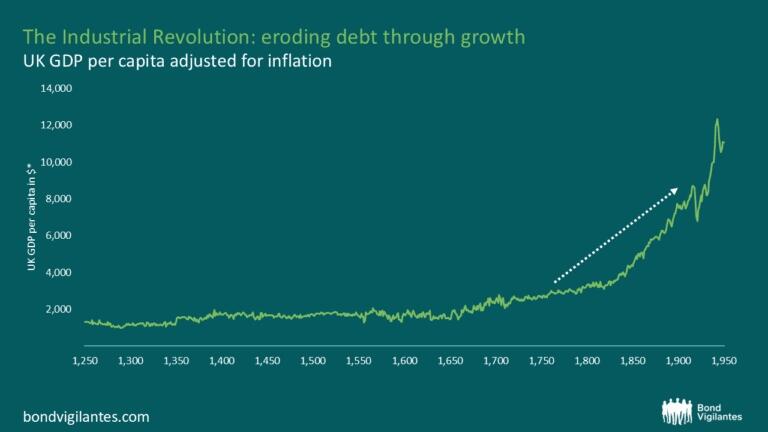 The Industrial Revolution transformed output and tax revenues, while the state held spending flat. The result was a slow but powerful denominator effect: GDP grew faster than the debt stock, even as prices remained stable or fell.