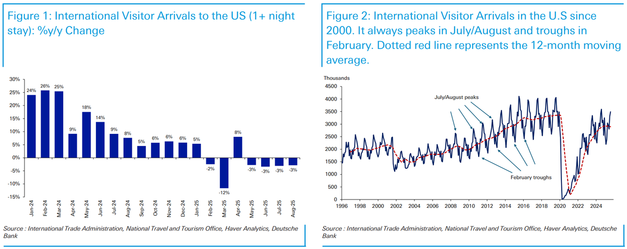 Visitor numbers did rebound afterward, but since then a clear and consistent year-on-year decline has emerged. Due to the government shutdown, we only have data through the end of August, yet in the Trump 2.025 world, arrivals now appear to be settling roughly 3% below last year’s levels. Of course, these are official entries; if illegal crossings were included, total arrivals would likely be lower still. The official decline appears to reflect both stricter enforcement at entry points and behavioral responses to the administration’s policies.