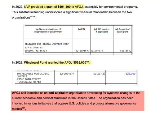 Also, there is evidence that NVF and Windward are linked to the anti-capitalist group, the Alliance for Global Justice (AFGJ), through substantial financial contributions.