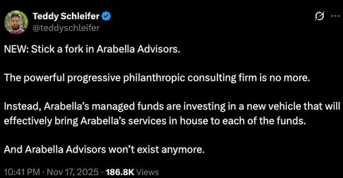 “Stick a fork in Arabella Advisors. The powerful progressive philanthropic consulting firm is no more,” New York Times reporter Teddy Schleifer wrote on X, adding, “Instead, Arabella’s managed funds are investing in a new vehicle that will effectively bring Arabella’s services in house to each of the funds. And Arabella Advisors won’t exist anymore.”