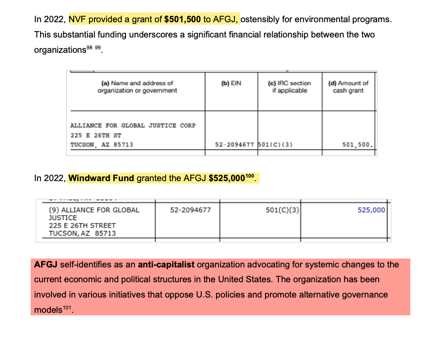 Also, there is evidence that NVF and Windward are linked to the anti-capitalist group, the Alliance for Global Justice (AFGJ), through substantial financial contributions.