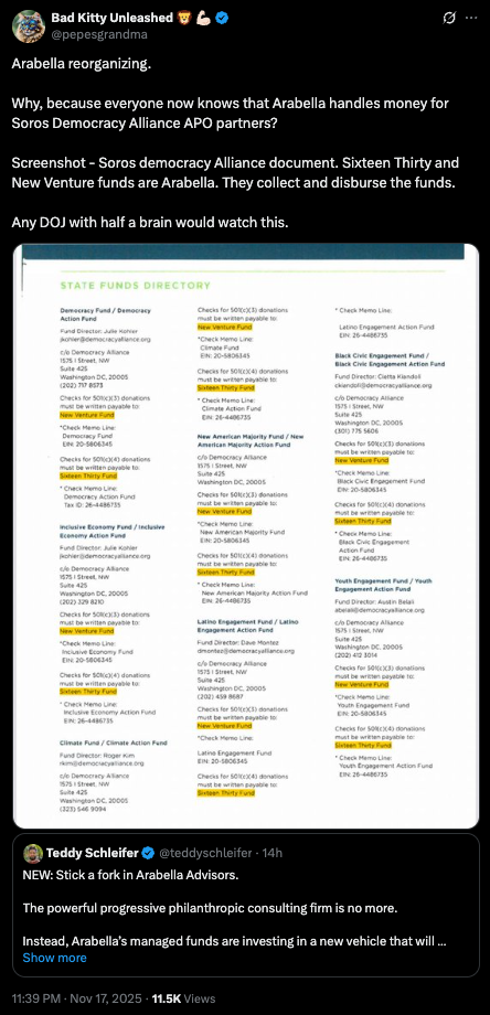 X user Bad Kitty Unleashed noted, “Arabella reorganizing. Why, because everyone now knows that Arabella handles money for Soros Democracy Alliance APO partners? Screenshot – Soros democracy Alliance document. Sixteen Thirty and New Venture funds are Arabella. They collect and disburse the funds. Any DOJ with half a brain would watch this.”