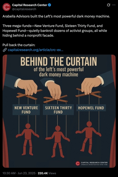Even though Arabella claims neutrality, overwhelming evidence from Peter Schweizer & Seamus Bruner of the Government Accountability Institute shows that through the Arabella network, some of these funds have supported organizations linked to left-wing, anti-capitalist, anti-police, anti-Israel, and at times anti-American agendas.