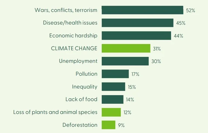The change has been dramatic. In 2025, public concern over climate change has fallen sharply behind concerns of war and economic instability, with geopolitical turmoil and the cost of living crisis. Ipsos’ 2025 Global Consumer Awareness Survey, which was published in collaboration with the Forest Stewardship Council (FSC), covers 50 countries and surveyed more than 40,000 respondents. It found that war and the economy now dominate public worries at 52%, while climate change trails at just 31%.
