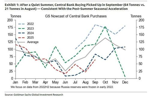 In a note published earlier today Lina Thomas (and available to pro subs), the Goldman gold analyst who correctly calculated China’s true purchases over a year ago, she writes that the bank’s latest gold nowcast estimates that central bank purchased 64 tonnes for September vs. 21 tonnes in August, and central bank buying likely continued in November: “We continue to see elevated central bank gold accumulation as a multi-year trend, as central banks diversify their reserves to hedge geopolitical and financial risks. We maintain our assumption of average monthly central bank buying of 80 tonnes in 2025Q4-2026“, Thomas wrote.