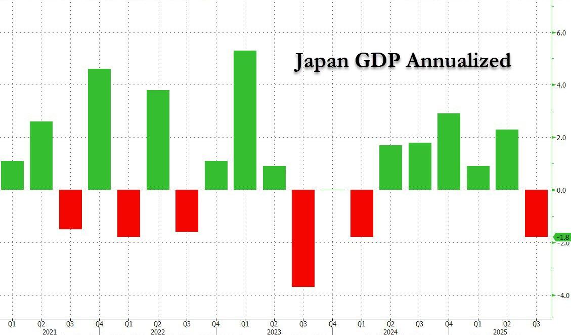 And with the recent surge in yields, driven by new PM Takaichi’s plans for a fresh stimulus boost (see “Japan ruling-party panel proposes $161 billion extra budget to fund stimulus“), now that the country is basically back in recession after the catastrophic Q3 GDP print which tied for the second worst since covid…