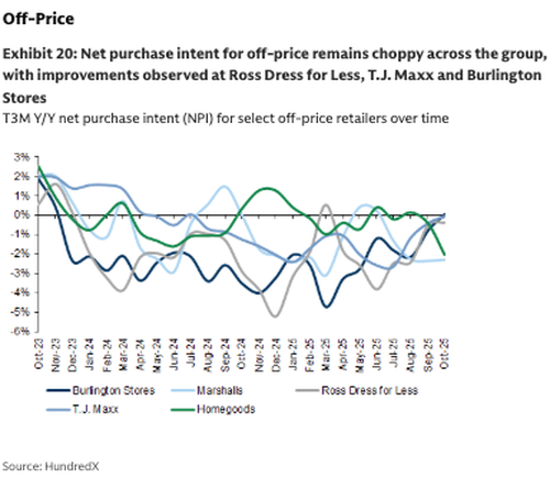 At the start of the week, Goldman analysts led by Brooke Roach commented on off-price retailers, citing HundreX data showing consumer net purchase intent toward retailers such as Ross Dress for Less, T.J. Maxx, and Burlington Stores, which are improving.