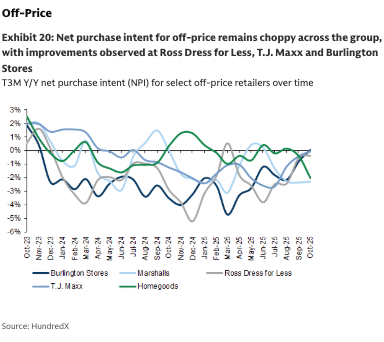 At the start of the week, Goldman analysts led by Brooke Roach commented on off-price retailers, citing HundreX data showing consumer net purchase intent toward retailers such as Ross Dress for Less, T.J. Maxx, and Burlington Stores, which are improving.