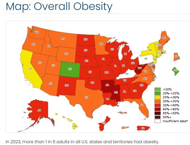 2. Our collective health is systemically worse. These charts from the Center for Disease Control (CDC) tell the story: in 1985, relatively few Americans were classified as obese (BMI of 30 or higher). While BMI is not an ideal measure, moderate BMI levels reflect a lifestyle of moderate activity and relatively healthy diet. By 2023, the situation had deteriorated to the point that by more recent metrics, almost 80% of adult Americans are overweight/obese, conditions that generate a spectrum of health risks.