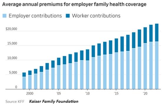 Here is a chart of healthcare insurance costs. This doesn’t reflect the erosion of value generated by the expansion of co-pays, deductions and exclusions.