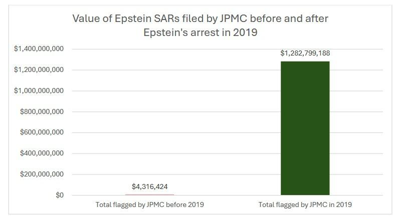The unsealed court records include copies of SARs that JPMC filed on Epstein’s accounts between 2002 and 2019. Between 2002 and 2016, JPMC filed 7 SARs flagging only $4.3 million in suspicious transactions from Epstein’s accounts.¹ Only after Epstein was arrested on federal sex trafficking charges did JPMC report the full extent of Epstein’s suspicious financial activity. In August and September of 2019, JPMC filed two SARs flagging more than 5,000 suspicious wire transfers moving approximately $1.3 billion in and out of Epstein’s accounts.² This is the strongest evidence yet that JPMC should face an investigation for failure to appropriately monitor and report Epstein’s financial activity.
