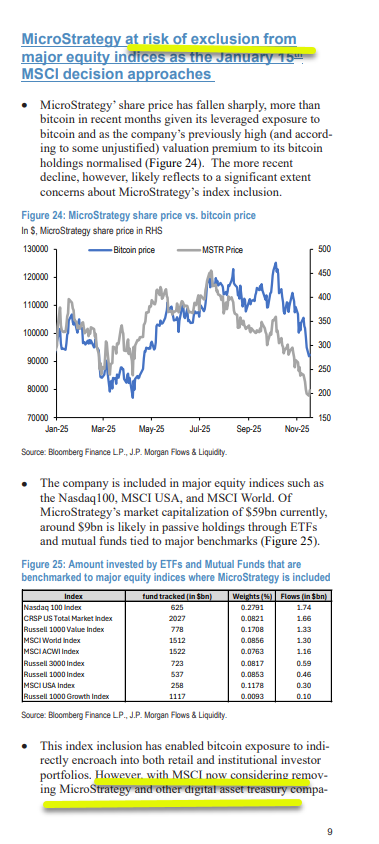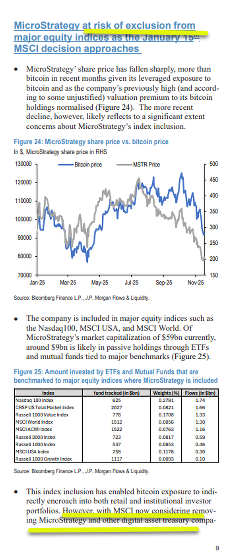 A JPMorgan analyst pointed out to clients the potential exclusion of MSTR from upcoming MSCI and Nasdaq reviews.