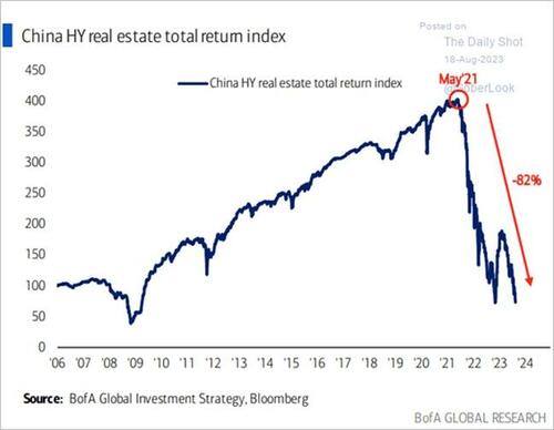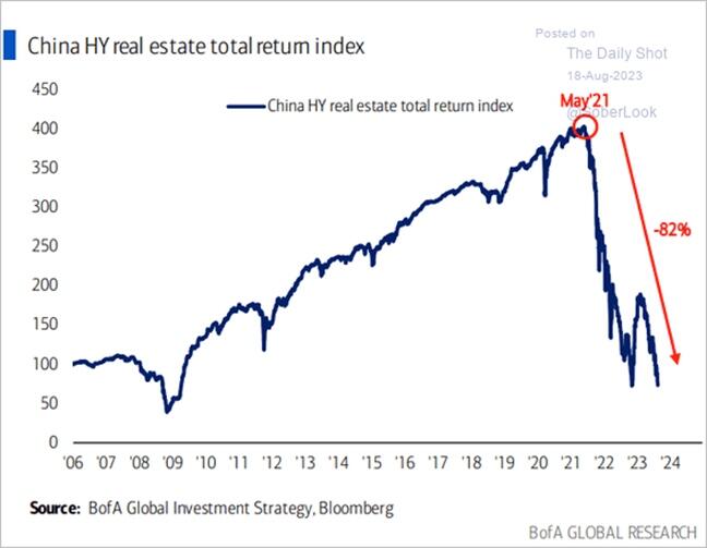The financial collapses of China Evergrande, Country Garden, and Sunac all come against the background of a broader crash in real estate debt and real estate-backed wealth management products. This chart shows that a major Chinese high-yield real estate index collapsed 82% in recent years and has never recovered.