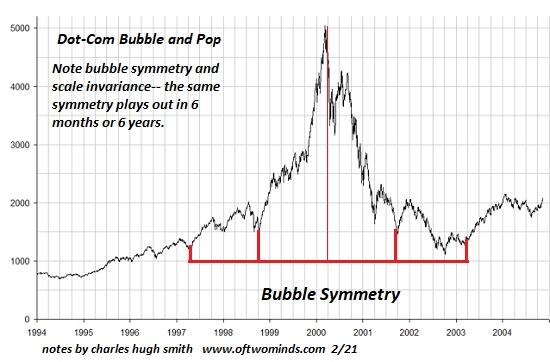 6. Even if the new technology continues expanding, the speculative bubble can deflate 80%. This is the lesson of the dot-com era: that the Internet continued to expand didn’t mean the speculative bubble continued inflating: the speculative bubble is not the same thing as the actual use-value in the real world.