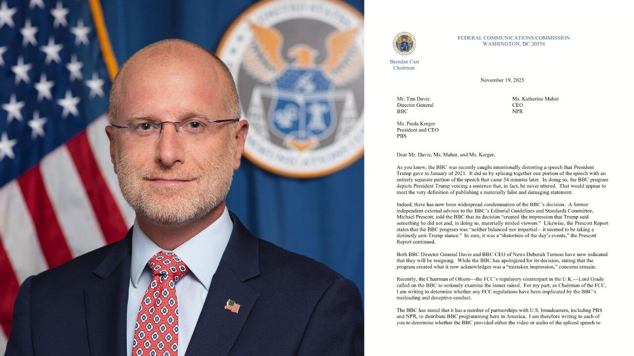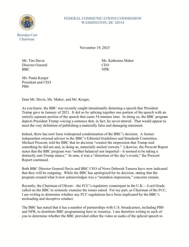 Carr’s letter to BBC’s Tim Davie, NPR’s Katherine Maher, and PBS’s Paula Kerger accuses the BBC of splicing Trump’s speech to “depict President Trump voicing a sentence that, in fact, he never uttered.”