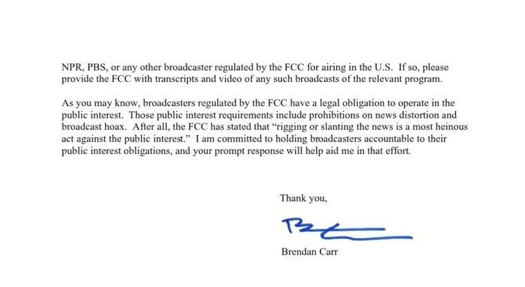 Carr looped in NPR and PBS for distributing BBC content, probing if they aired the distorted speech—emphasizing U.S. broadcasters’ duty to avoid “news distortion.”