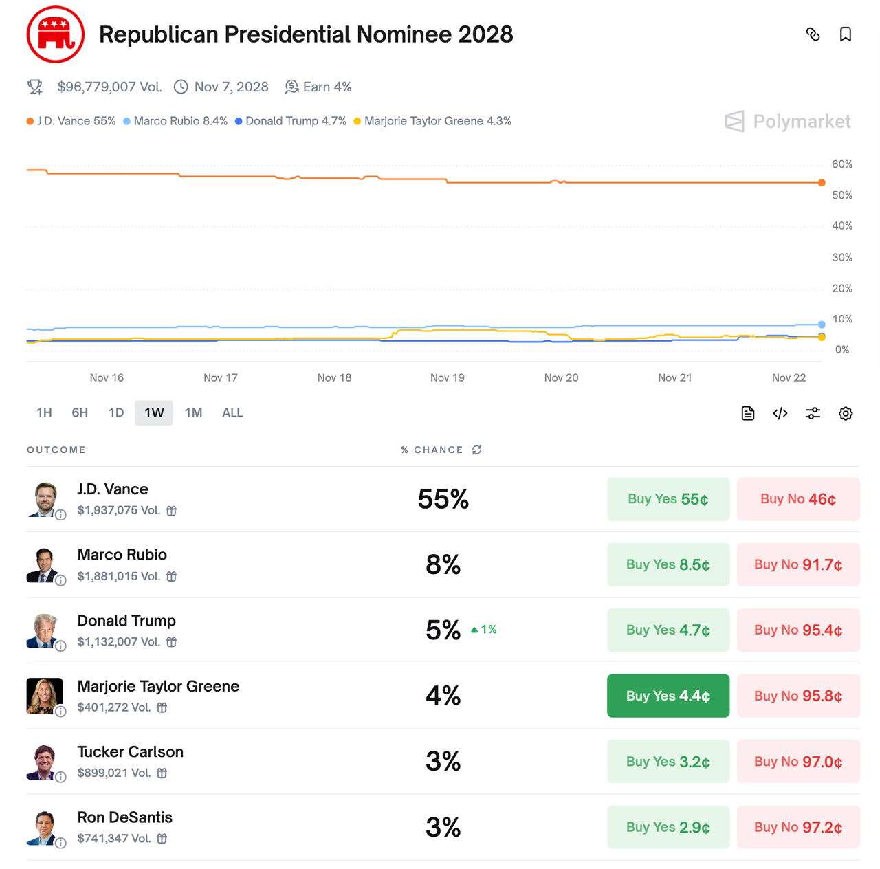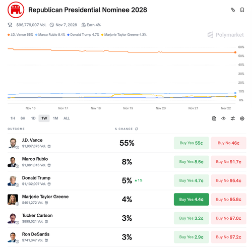 Given Bannon’s comments, we turn to Polymarket, where MTG currently sits at just 4% odds of becoming the Republican presidential nominee in 2028. J.D. Vance leads with 55%, followed by Marco Rubio at 8%. Interesting to note, Tucker Carlson has 3% odds.