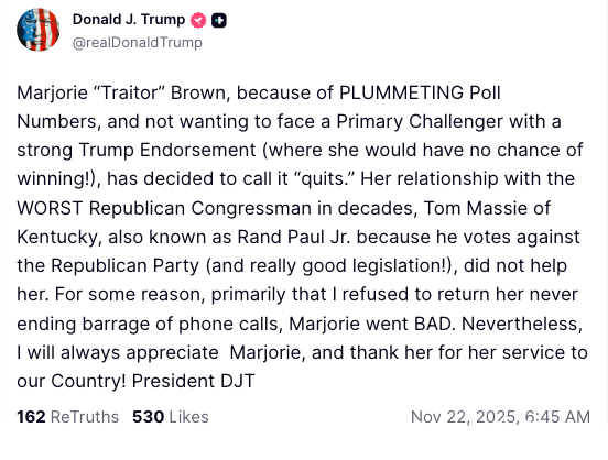 Marjorie “Traitor” Brown, because of PLUMMETING Poll Numbers, and not wanting to face a Primary Challenger with a strong Trump Endorsement (where she would have no chance of winning!), has decided to call it “quits.” Her relationship with the WORST Republican Congressman in decades, Tom Massie of Kentucky, also known as Rand Paul Jr. because he votes against the Republican Party (and really good legislation!), did not help her. For some reason, primarily that I refused to return her never ending barrage of phone calls, Marjorie went BAD. Nevertheless, I will always appreciate  Marjorie, and thank her for her service to our Country! President DJT